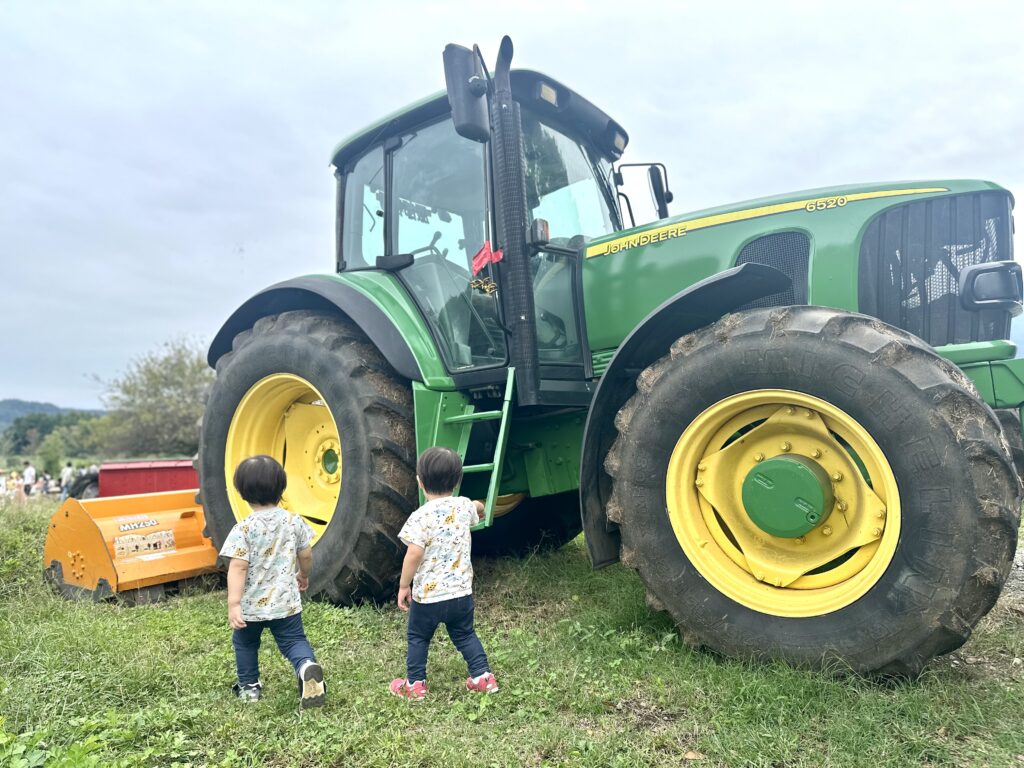 子どもたちは大喜び。トラクターの展示やヤギのエサやり体験、