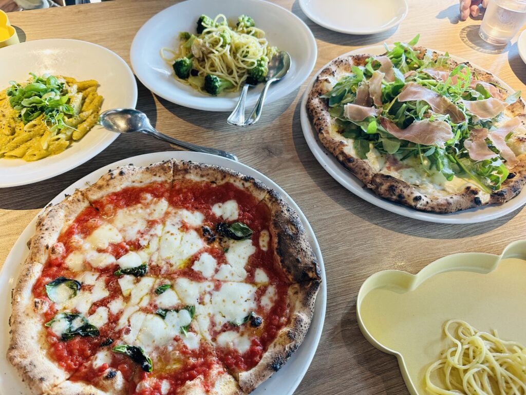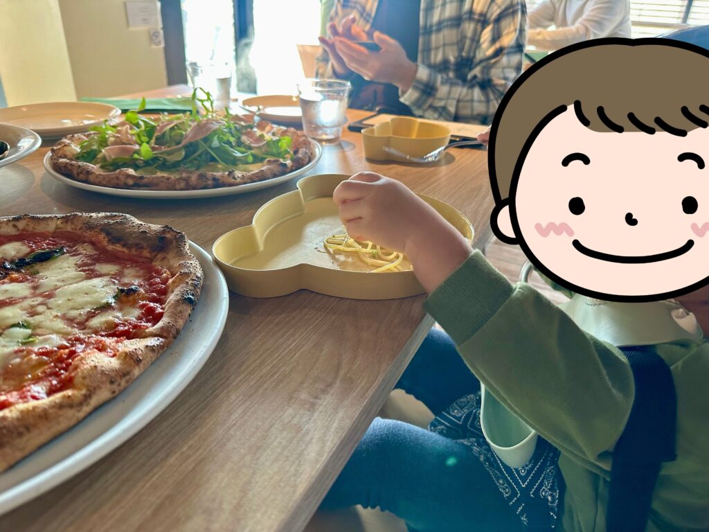注文したピッツァとパスタはどれも大人向けの味付けでしたが、