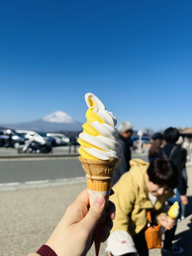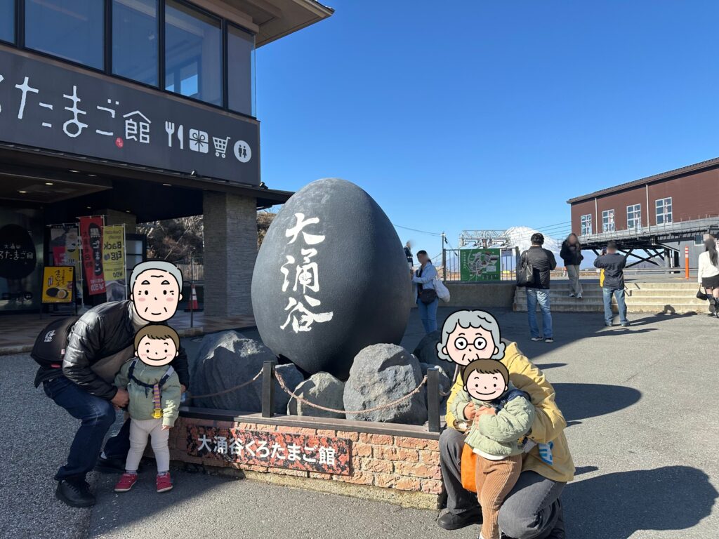 名物のくろたまごオブジェの前で記念撮影をし、富士山を背景に家族写真も撮ることができました。