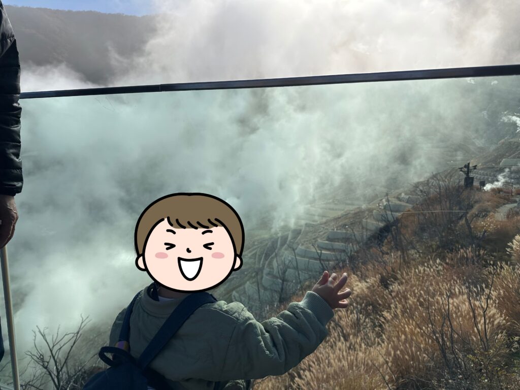 噴煙が立ち上る様子を見て「もくもく!」と興奮する姿は、この年齢ならではの反応でした。